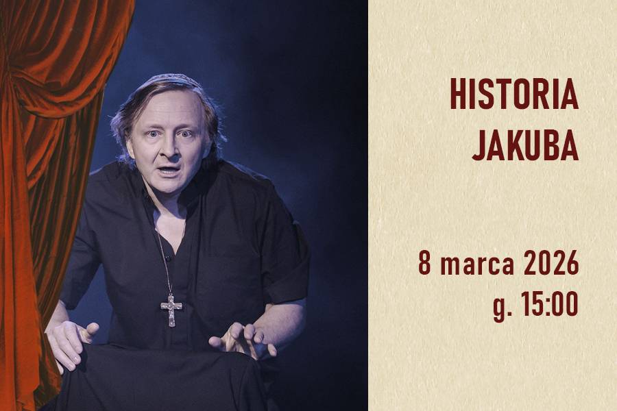 „Historia Jakuba” Reżyseria: Aldona Figura Scenografia: Joanna Zemanek Produkcja: Fundacja Zatrzymać Czas Premiera: 23 lipca 2023 Monodram powstał na podstawie scenariusza Tadeusza Słobodzianka, autora granej w wielu krajach „Naszej klasy”. Inspiracją dramatopisarza były skomplikowane losy żyjącego do dziś w Jerozolimie księdza-filozofa Romualda Jakuba Wekslera-Waszkinela, urodzonego w żydowskiej rodzinie, oddanego na wychowanie Polakom. Kiedy dowiaduje się, że nie jest tym, kim jest próbuje odkryć swoją prawdziwą tożsamość, ale we współczesnym świecie, gdzie trzeba jasno określić pochodzenie, wiarę czy narodowość, zaczyna coraz bardziej odczuwać inność i obcość. Próby scalenia na nowo swojej osobowości raz po raz narażają go na nieoczekiwane sytuacje i przygody, które od tragizmu chroni śmiech i wartka, burleskowa akcja. Łukasz Lewandowski sugestywnie ukazuje zmagania bohatera, katolickiego księdza, który dowiaduje się, że jest Żydem, z tą podwójną tożsamością, jego usiłowania scalenia ich nie tyle poza religiami i tradycjami, ile ponad nimi. Artystyczna czystość i spoistość spektaklu oraz idealne wyczucie formy sprawiają, że przesłanie dramatu Słobodzianka staje się czytelne. Tomasz Miłkowski