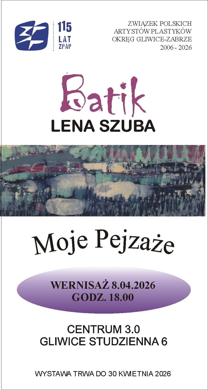 "Moje Pejzaże" wystawa dzieł Leny Szuby wykonanych w technice batiku.