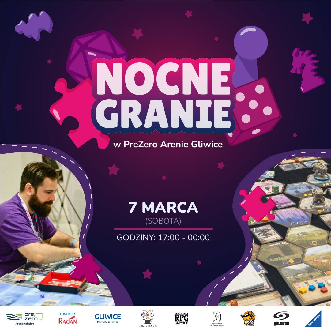 Zapraszamy na kolejne NOCNE GRANIE w PreZero Arenie Gliwice Będą planszówki, sesje rpg i puzzle!