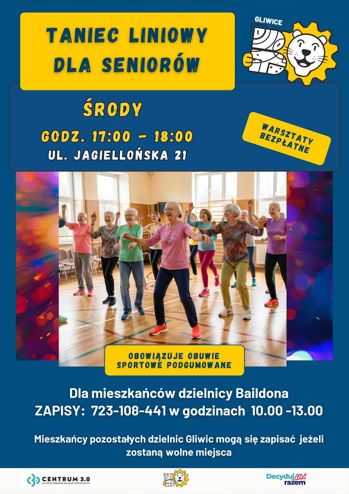 Zapraszamy seniorów na bezpłatne warsztaty tańca liniowego, które odbywają się w siedzibie przy ul. Jagiellońskiej 21 w Gliwicach. Zajęcia skierowane są przede wszystkim do mieszkańców dzielnicy Baildona. Mieszkańcy pozostałych dzielnic Gliwic mogą wziąć udział w przypadku dostępności wolnych miejsc.